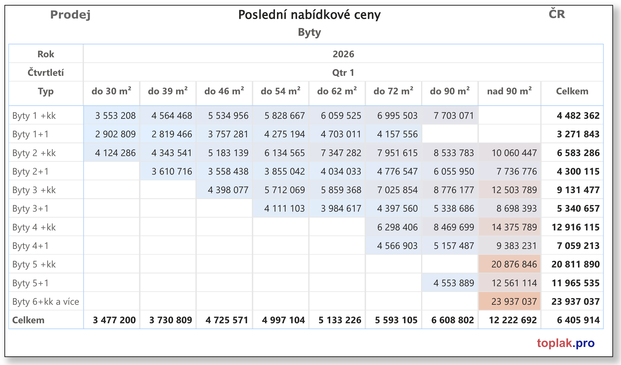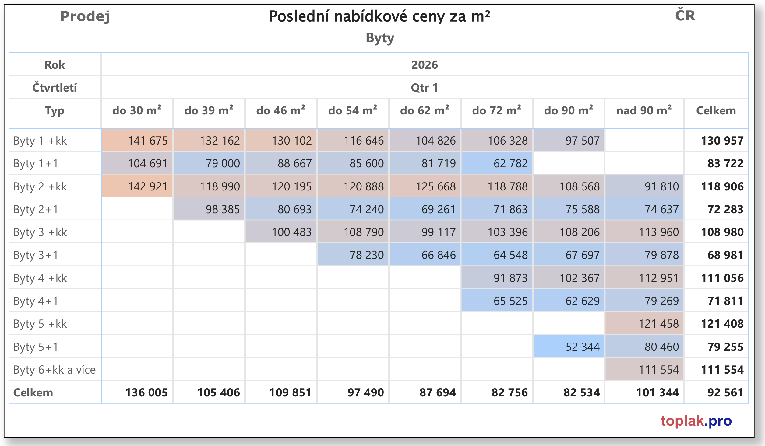 Realitní trh je často interpretován přes dispozice bytů – 1+kk, 2+1, 3+kk. Tento způsob uvažování je hluboce zakořeněný jak mezi kupujícími, tak i v části odborné praxe. Detailní analýza aktuálních dat z prvního čtvrtletí roku 2026 však ukazuje jiný obraz: hlavním faktorem ceny bytu není dispozice, ale jeho velikost v metrech čtverečních.