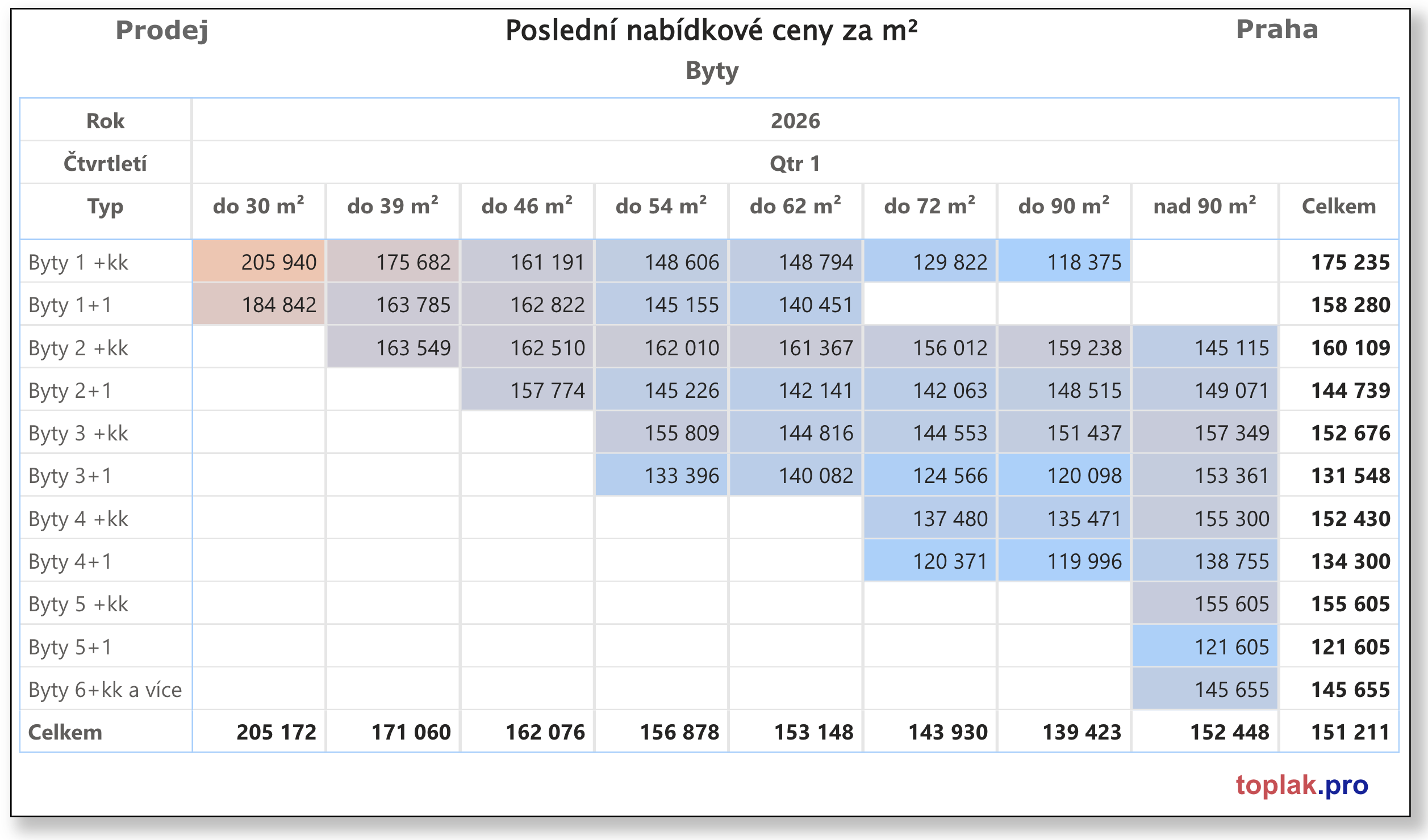 - střední byty (50–70 m²): cca 150 tis. Kč/m²