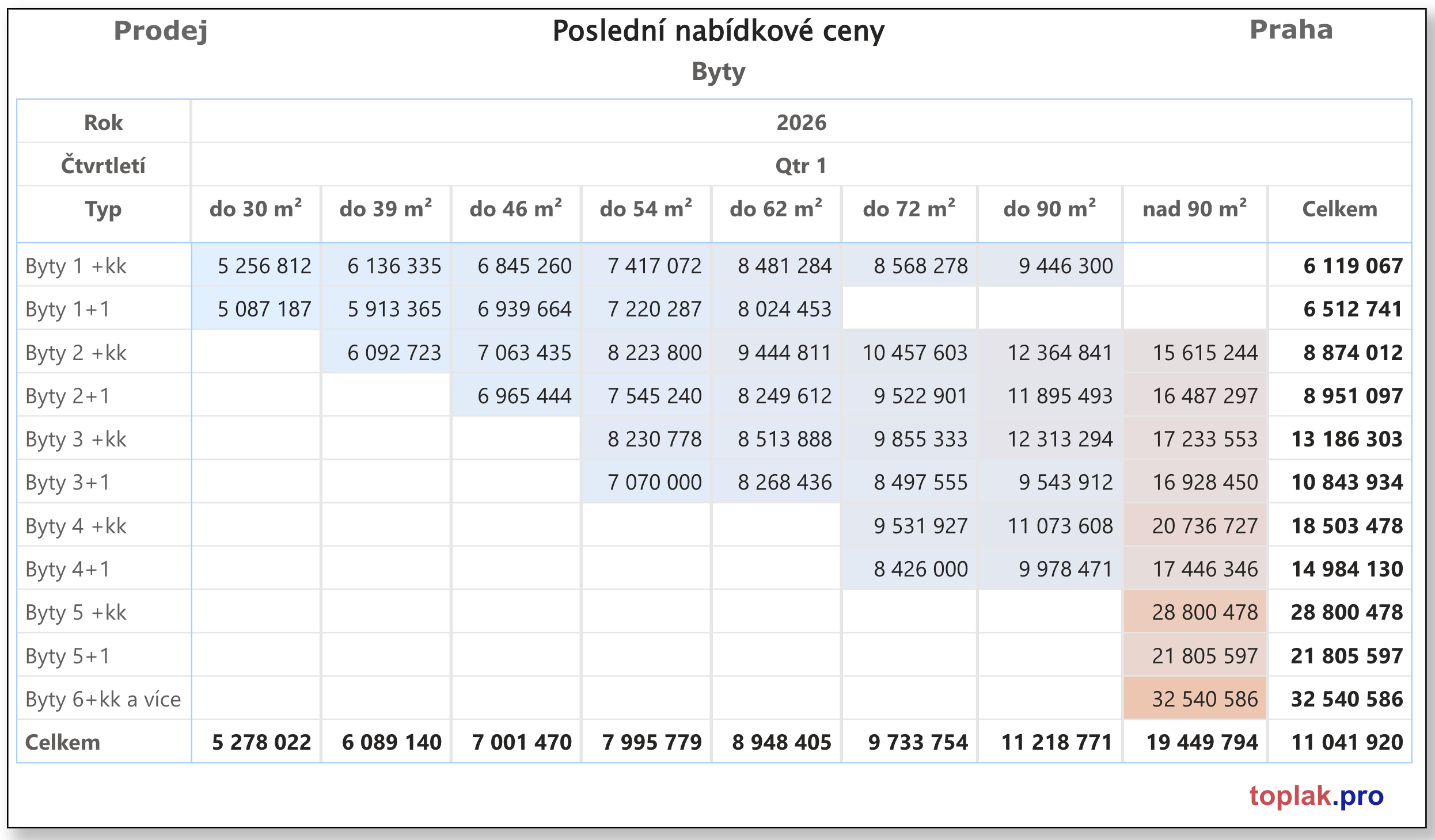 - větší byty (nad 90 m²): cca 140 tis. Kč/m²